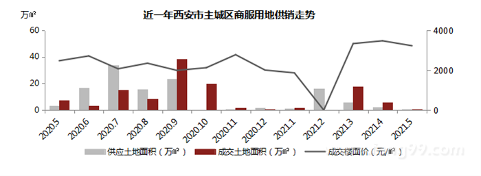 2021年5月,西安主城区商服土地市场成交0.25万㎡,1宗,平均楼面价3225元/㎡,成交面积环比下降96%。供应0.18万㎡、1宗,供应面积环比下降92%。