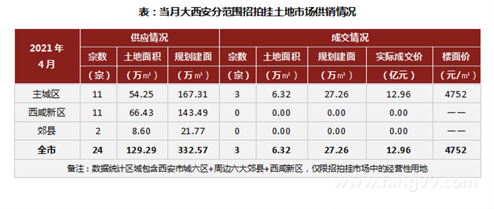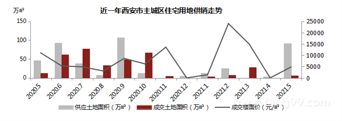 2021年5月,西安主城区住宅土地市场成交6.06万㎡,2宗,平均楼面价4810元/㎡,供应91.88万㎡,15宗。