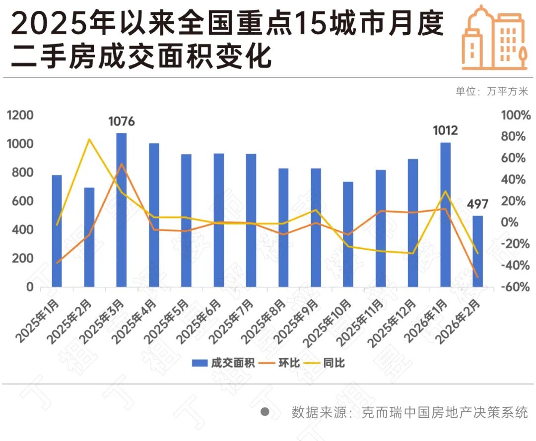 克而瑞监测数据显示,2026年2月,全国重点15城市二手房成交面积约497万平方米,1-2月累计成交面积约1509万平方米,同比微增2%。