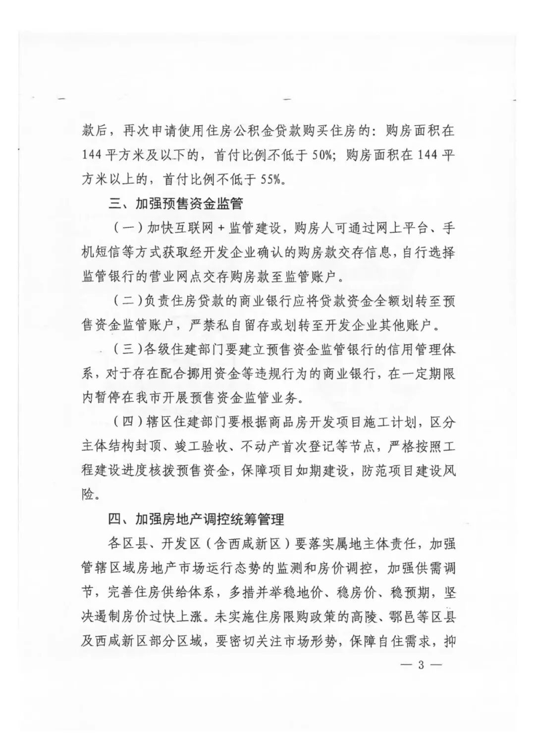各区县、开发区(含西咸新区)要落实属地主体责任,加强管辖区域房地产市场运行态势的监测和房价调控,加强供需调节,完善住房供给体系,多措并举稳地价、稳房价、稳预期,坚决遏制房价过快上涨。未实施住房限购政策的高陵、鄠邑等区县及西咸新区部分区域,要密切关注市场形势,保障自住需求,抑制投资投机行为,稳定房地产市场发展。