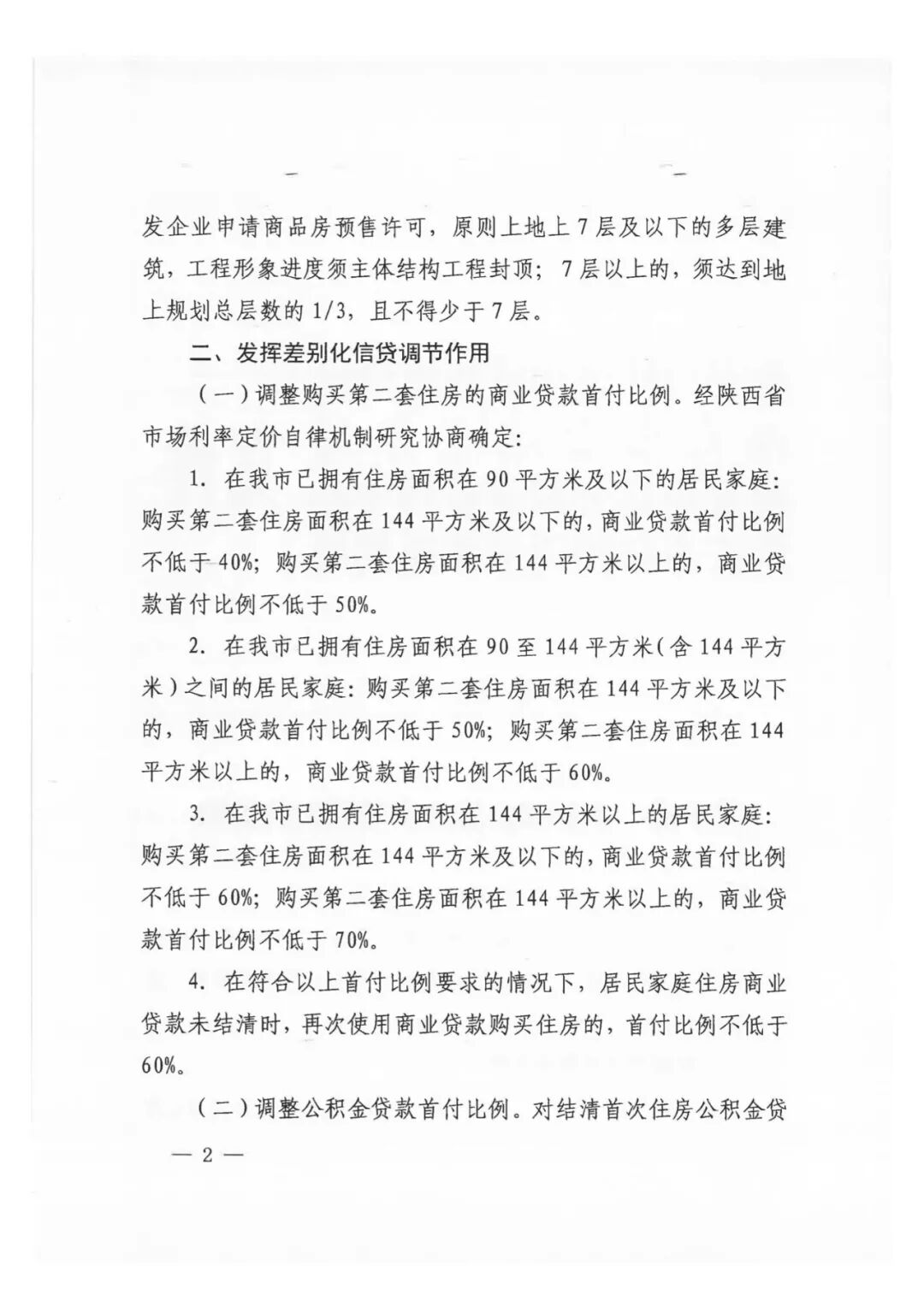 (一)调整购买第二套住房的商业贷款首付比例。经陕西省市场利率定价自律机制研究协商确定:1. 在我市已拥有住房面积在90平方米及以下的居民家庭:购买第二套住房面积在144平方米及以下的,商业贷款首付比例不低于40%;购买第二套住房面积在144平方米以上的,商业贷款首付比例不低于50%。2. 在我市已拥有住房面积在90至144平方米(含144平方米)之间的居民家庭:购买第二套住房面积在144平方米及以下的,商业贷款首付比例不低于50%;购买第二套住房面积在144平方米以上的,商业贷款首付比例不低于60%。3. 在我市已拥有住房面积在144平方米以上的居民家庭:购买第二套住房面积在144平方米及以下的,商业贷款首付比例不低于60%;购买第二套住房面积在144平方米以上的,商业贷款首付比例不低于70%。4. 在符合以上首付比例要求的情况下,居民家庭住房商业贷款未结清时,再次使用商业贷款购买住房的,首付比例不低于60%。(二)调整公积金贷款首付比例。对结清首次住房公积金贷款后,再次申请使用住房公积金贷款购买住房的:购房面积在144平方米及以下的,首付比例不低于50%;购房面积在144平方米以上的,首付比例不低于55%。